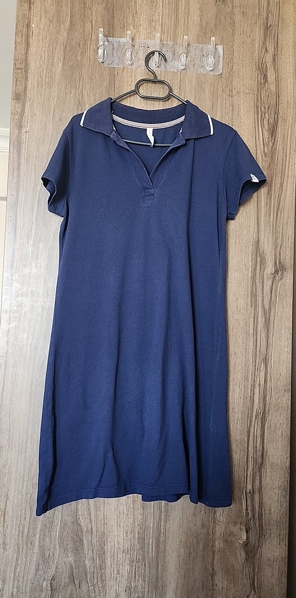 Lacivert midi boy, polo yaka kısa kollu elbise. Yumuşak sentetik kumaştan, rahat ve salaş kesim, gündelik kullanım için uygundur. arkasında ense kısmında küçük bir iz var