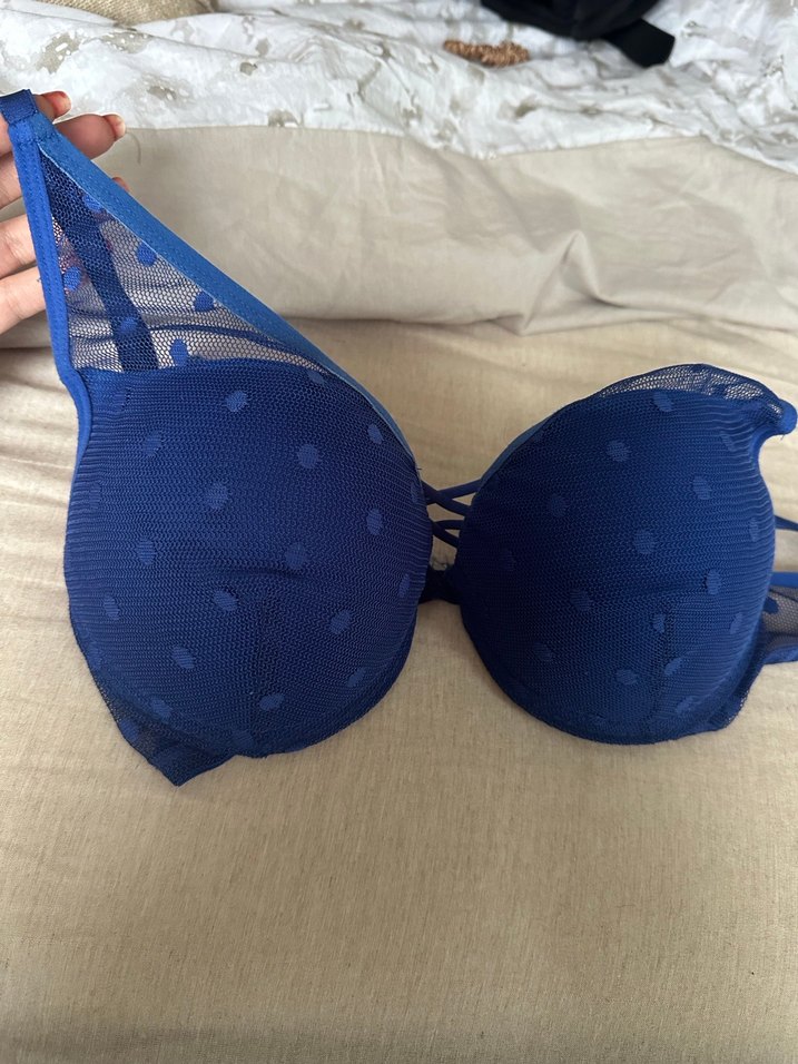 Lacivert puantiyeli, bohem Paris tarzı sütyen. Normal uzunlukta ve şık rahat bir kullanım sunar.