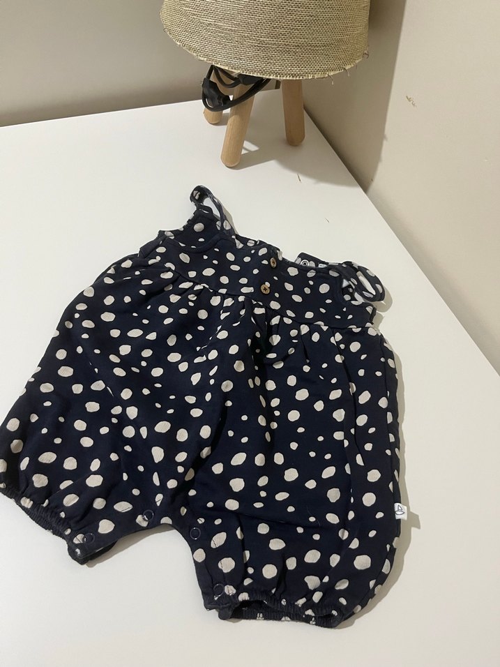 Lacivert renkli, puantiyeli ve fırfırlı detaylara sahip bebek tulumu, şık ve rahat bir seçenek sunar.