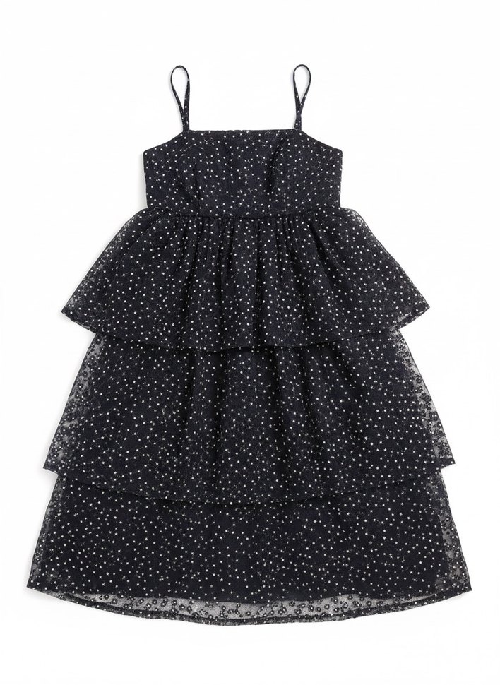 ince askılı ve straplez yakalı, kat kat fırfırlı tasarıma sahip. Lacivert zemin üzerine beyaz puantiyeli, şık stil sunar.