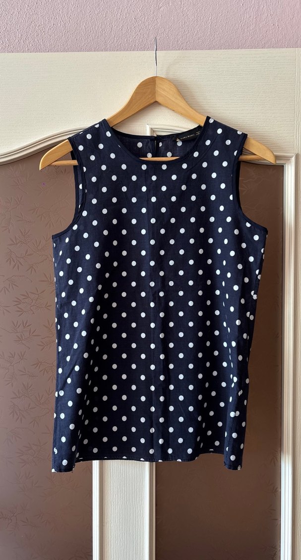 Lacivert zemin üzerine beyaz puantiyeli, kolsuz, yuvarlak yakalı, düğmeli pamuklu bluz. Rahat ve salaş kesimli, günlük kullanıma uygun.