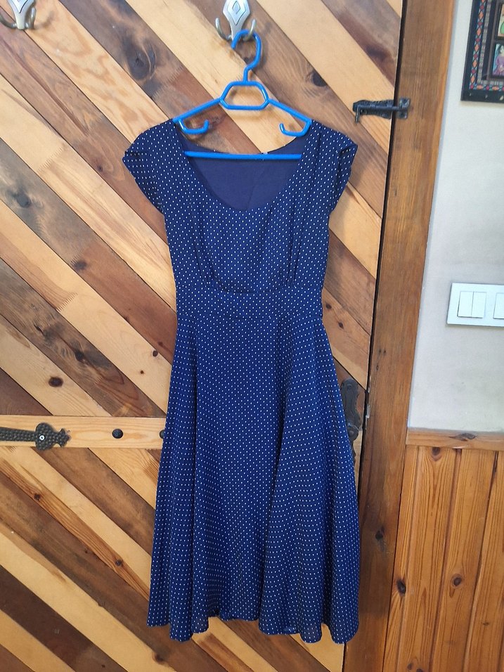 Lacivert puantiyeli midi boy, V yakalı, oturan kesim bohem elbise. Sentetik yumuşak kumaştan, pileli etek ve kolsuz tasarım.