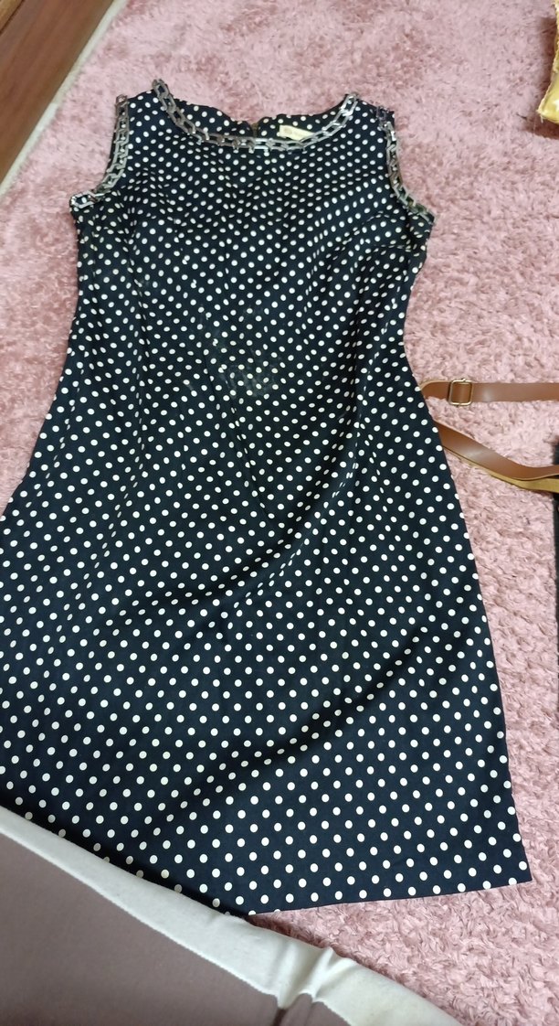 Lacivert puantiyeli, kolsuz, notched lapel yakalı, vücuda oturan midi elbise. Fırfır detaylarıyla sokak stiline uygundur.