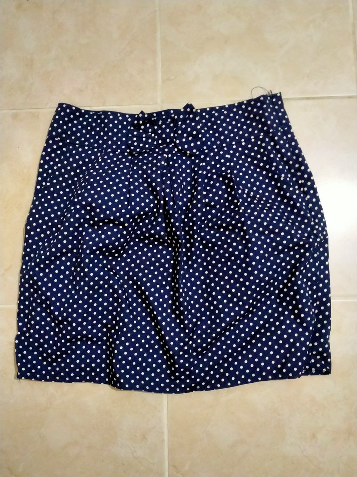 puantiyeli desenli, sentetik kumaştan yapılmış lacivert midi etek, bol kesim ve günlük sokak stili için uygun.önde kurdele var