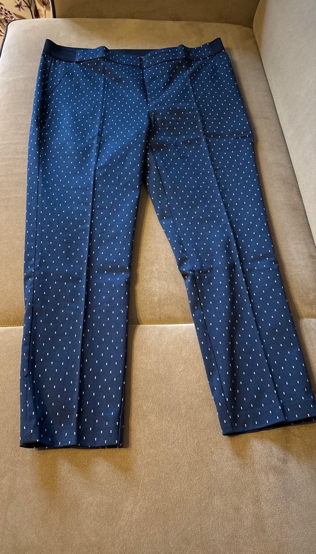 Lacivert puantiyeli kot pantolon, regular fit ve midi boydadır. Ofis ve sokak tarzı için uygun, tokalı detaylıdır.