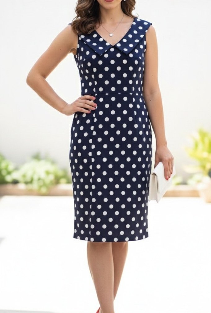 Lacivert renkte, beyaz puantiyeli midi kalem elbise, V yaka ve kolsuz tasarıma sahiptir. Rahat kalıplı ve sentetik dokulu kumaştan üretilmiştir. Ofis için çağdaş ve zahmetsiz şıklık sunar.
