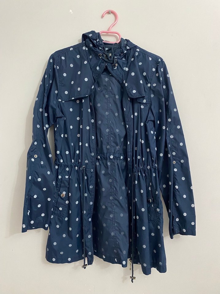 Lacivert renkli, beyaz puantiyeli midi yağmurluk. Uzun kollu, düğmeli ve salaş kesimdir. Notlu yaka ve günlük kullanım için uygundur. ☔️ fermuarı bozuktur