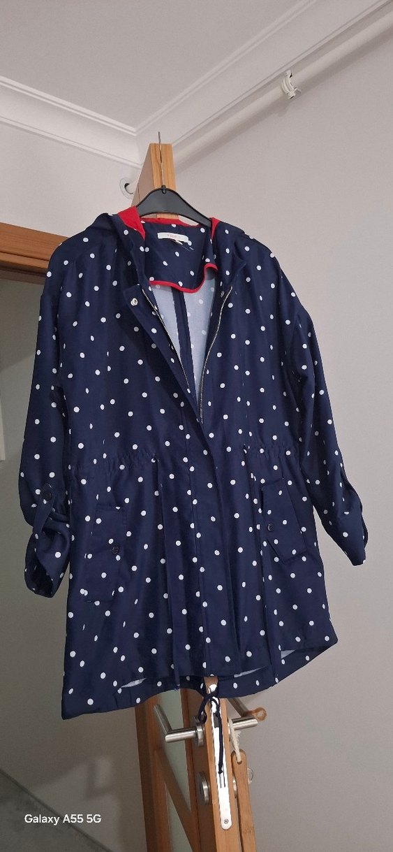 Pamuklu, düğmeli, notched lapel yakalı lacivert puantiyeli midi boy yağmurluk. Rahat kesim ve uzun kolludur, günlük sokak stiline uygundur. ️