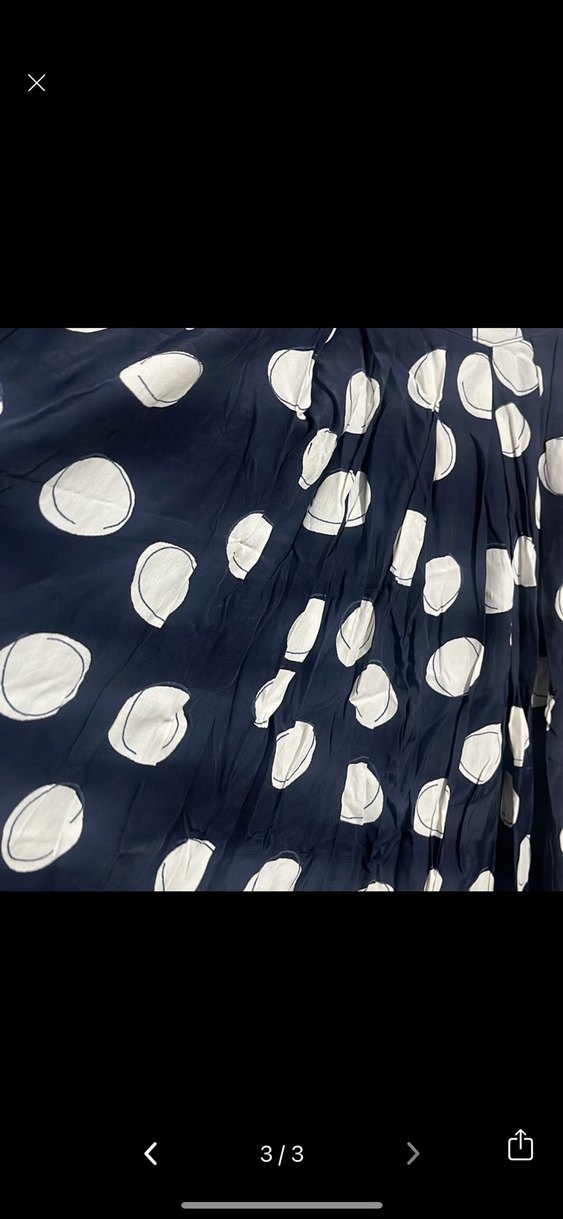 Lacivert zemin üzerine beyaz puantiyeli, piliseli detaylara sahip uzun ve bol kesim etek sentetik kumaştan üretilmiştir.