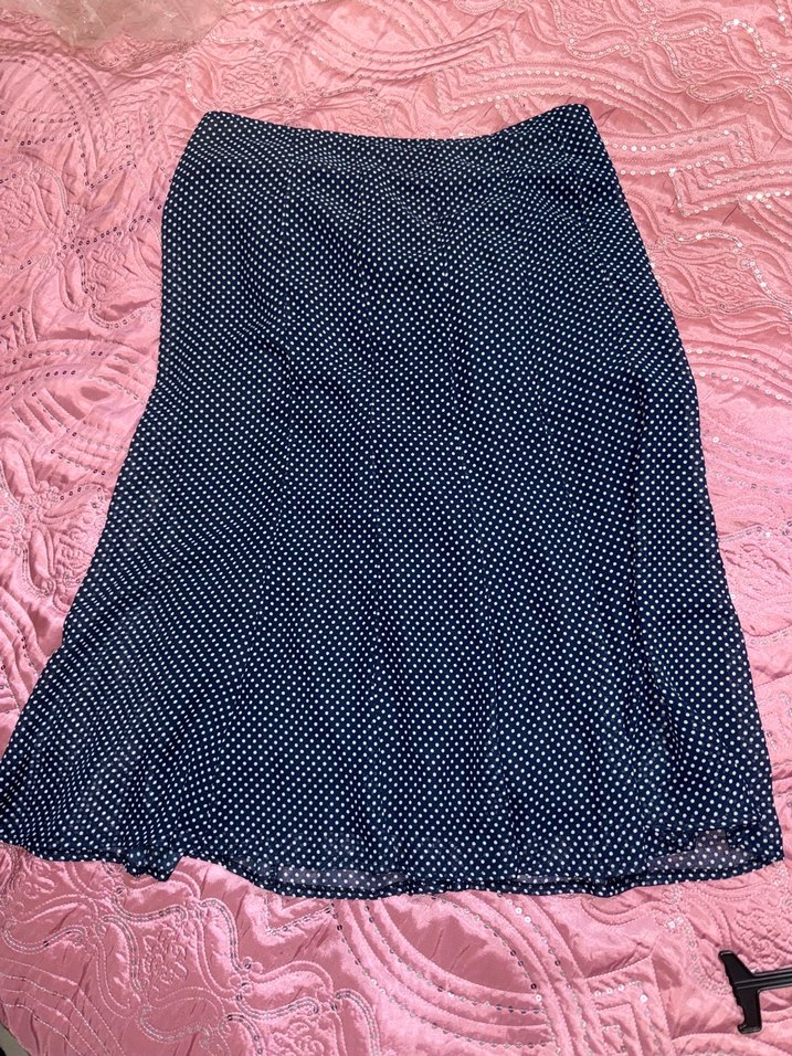 Lacivert puantiyeli, piliseli, midi boy etek, volân kesim ve yumuşak şifon kumaştan, Paris tarzı bohem havasında.