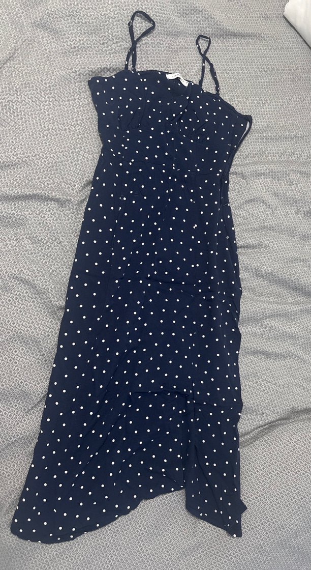 Lacivert zemin üzerine beyaz puantiyeli, uzun ve vücuda oturan elbise. V yaka, askılı kol ve fırfır detaylarıyla şık bir görünüm sağlar. Askısın da fotoğrafta göstermeye çalıştım ufak bir deforme var diyebiliriz onun dışında bir sorun yok yazlık çok güzel bir elbise