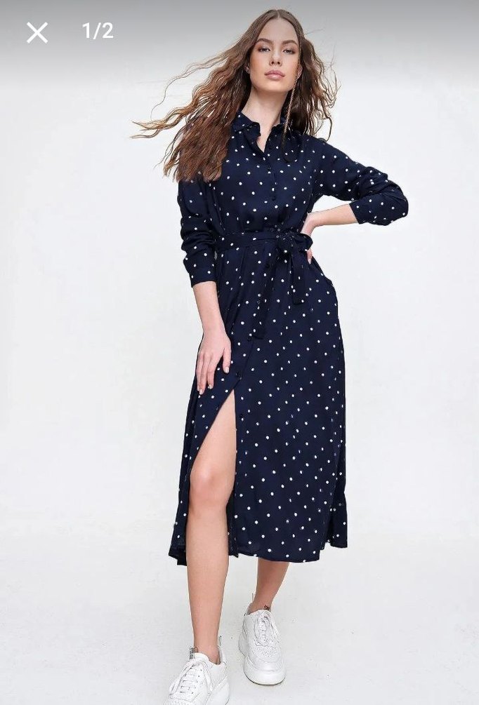 Lacivert uzun kollu, beyaz puantiyeli salaş elbise. V yaka ve kemerli bel detayıyla rahat bir kullanım sunar. Yumuşak sentetik kumaştan üretilmiştir.