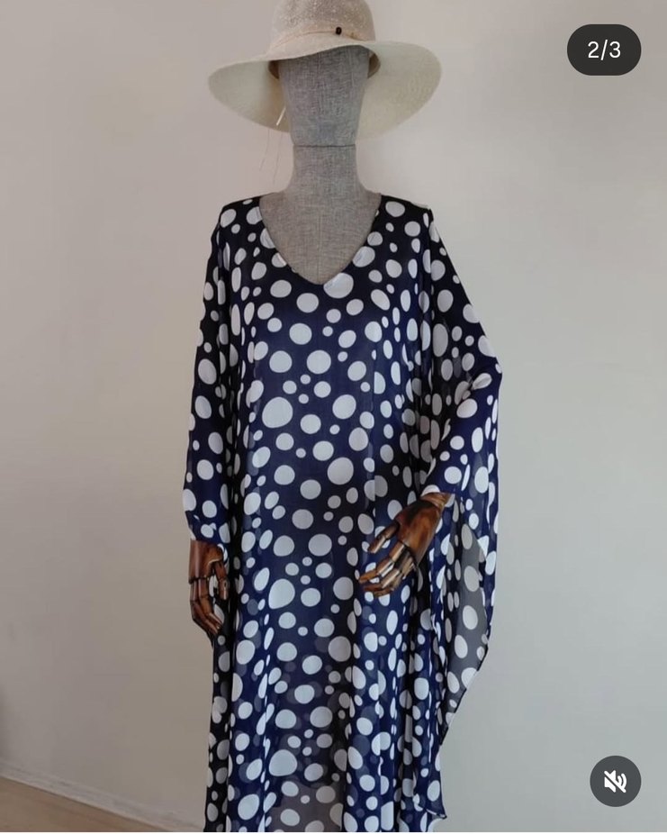 Lacivert zemin yarasa kollu, V yaka, bol kesim ve uzun pareo