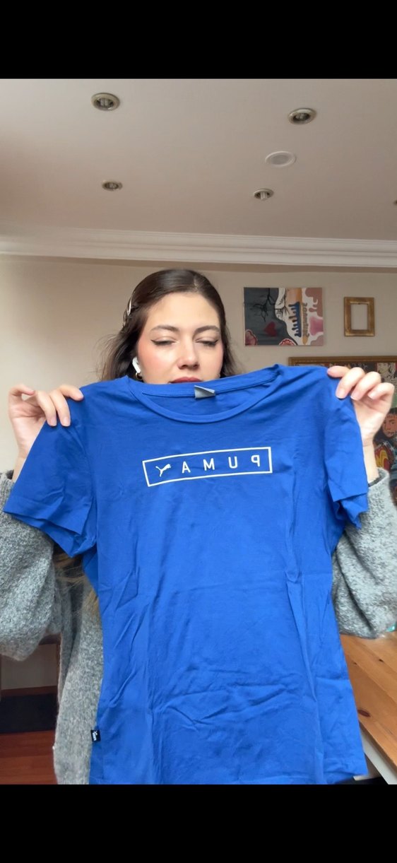 Mavi renkli, baskılı ve kısa kollu hamile tişörtü, salaş kesimi ve normal boyu ile günlük kullanıma uygundur. Denim görünümlü kumaştan üretilmiştir.