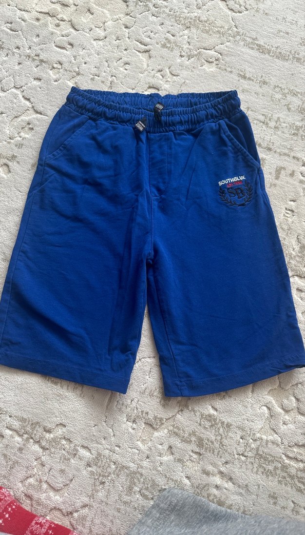 Lacivert, rahat kesim erkek şort, düğmeli bel ve yumuşak kumaş ile sokak stiline uygun. Yan cepler ve küçük nakışlı logo bulunur.