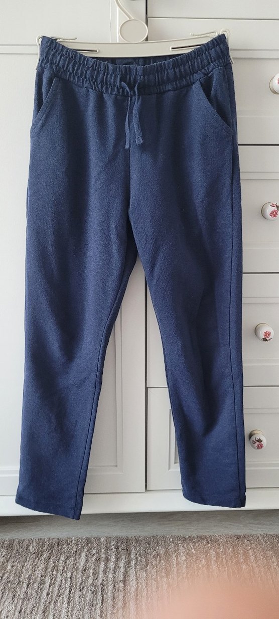 Yumuşak ve sıcak kumaştan, normal boyda, sade tasarımlı lacivert rahat kesim eşofman altı, günlük kullanım için uygundur. Sorunsuz