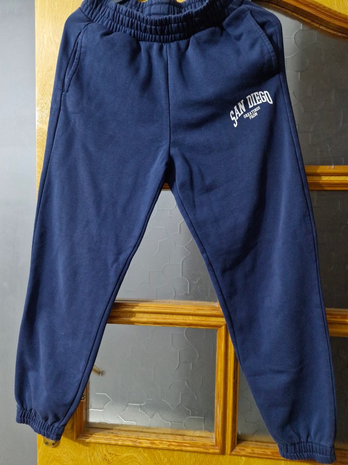 Lacivert renkli, rahat kesimli ve baskılı bu kadın eşofman altı, yumuşak ve sıcak kumaştan spor ve günlük kullanım için uygundur.