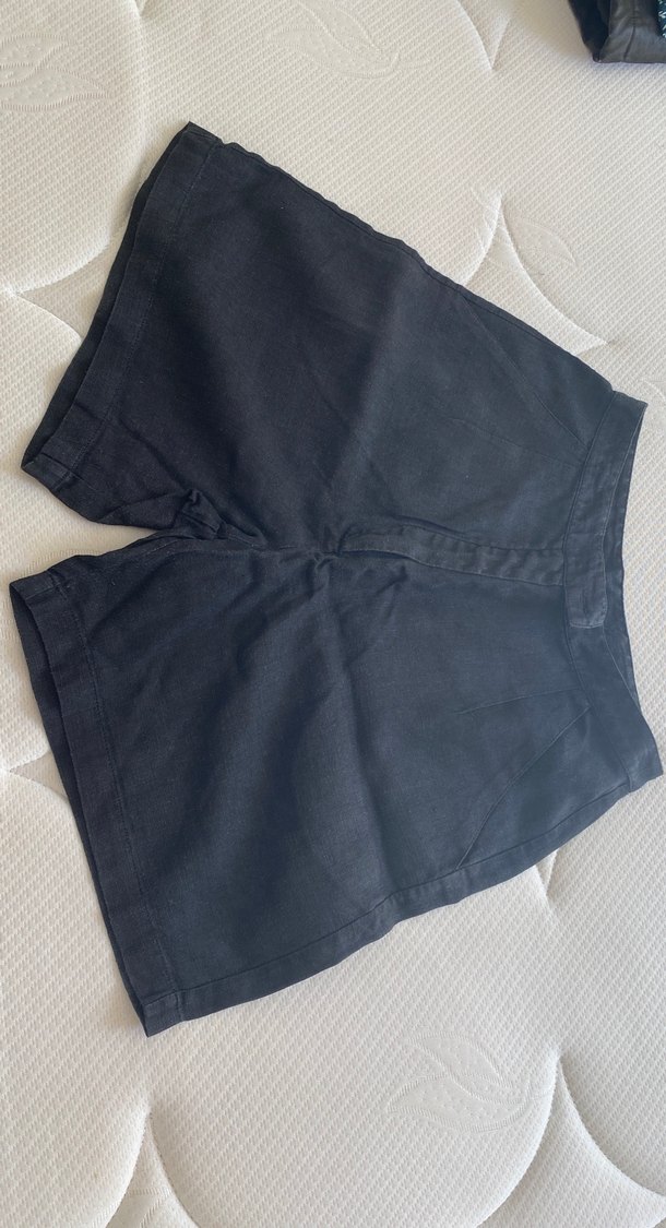 Lacivert keten kumaştan, bol kesim ve midi boyda şort günlük kullanım için rahat ve şık bir seçenek sunar.