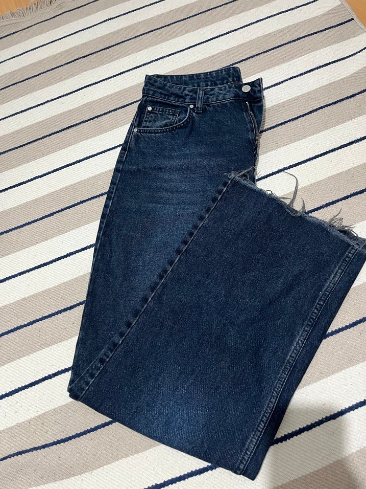 Lacivert kot pantolon, regular fit ve midi boyda. Günlük kullanım için rahat ve şık bir sokak stili sunar.