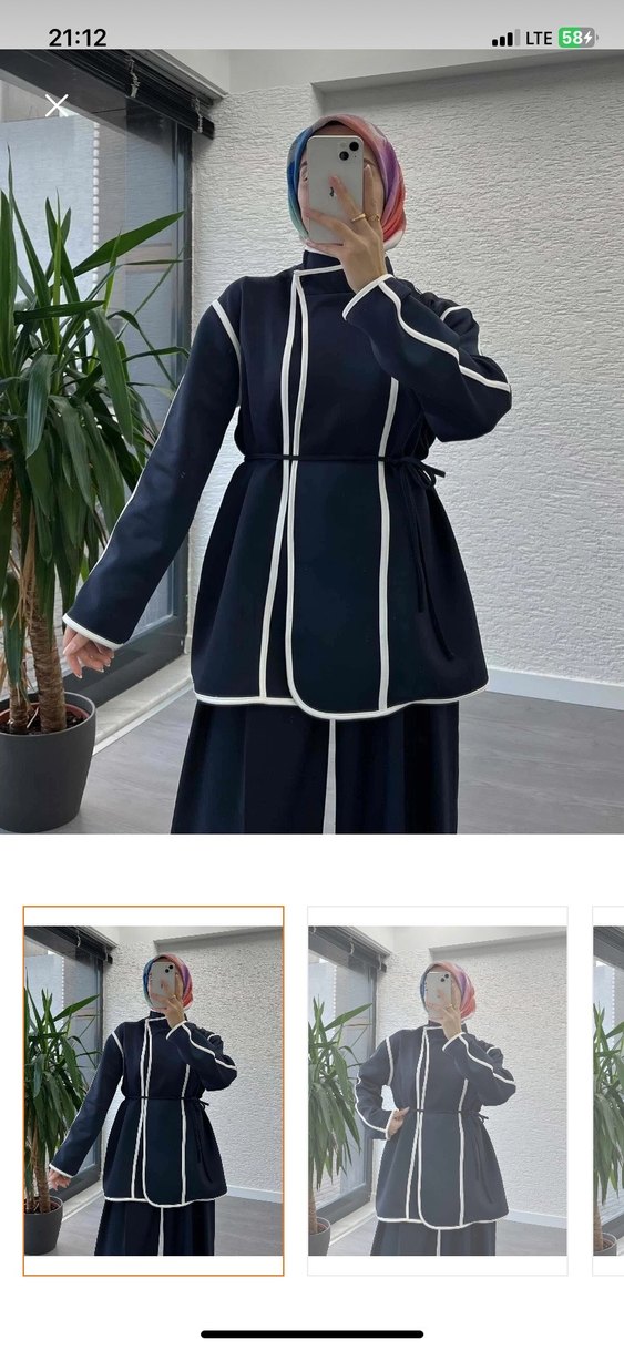 Lacivert renginde, beyaz şerit detaylı uzun kollu kadın ceketi, pileli tasarımıyla şık bir ofis görünümü sunar. Sadece bir kere giyildi