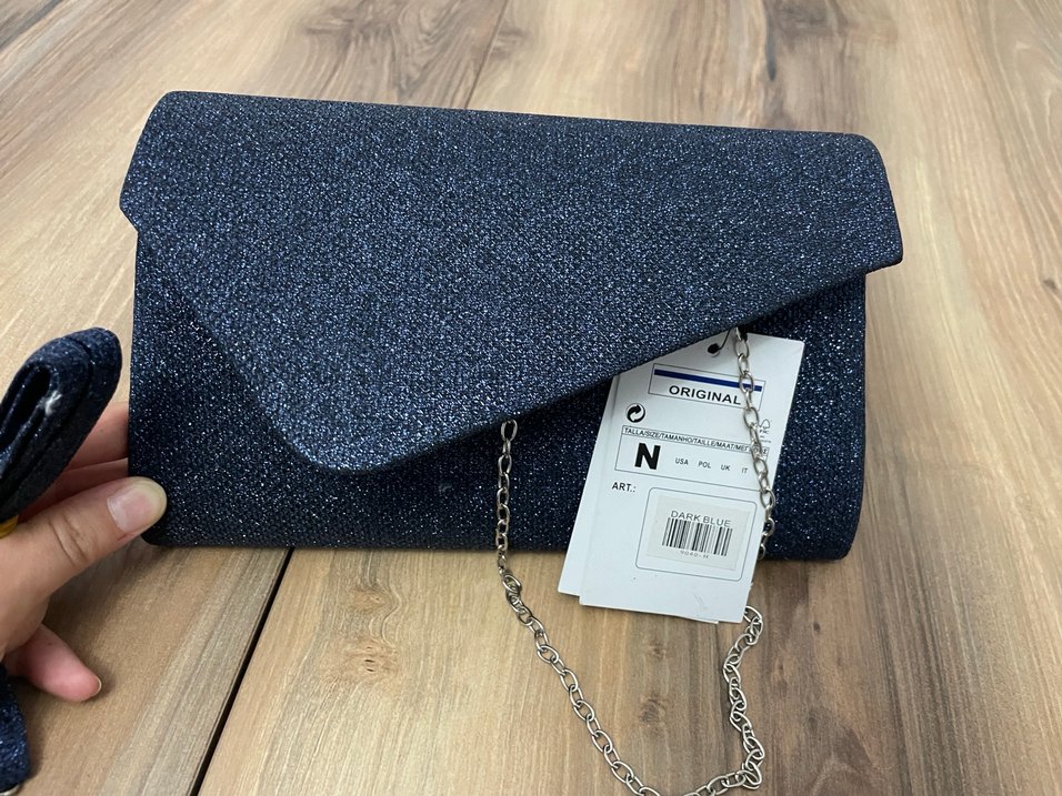 Lacivert renkte zincir detaylı kadın el zinciri. Baskılı desene sahip, rahat ve gündelik kullanıma uygun normcore tarzda. Etikette 'ART, ORIGINAL' yazıyor. ✨