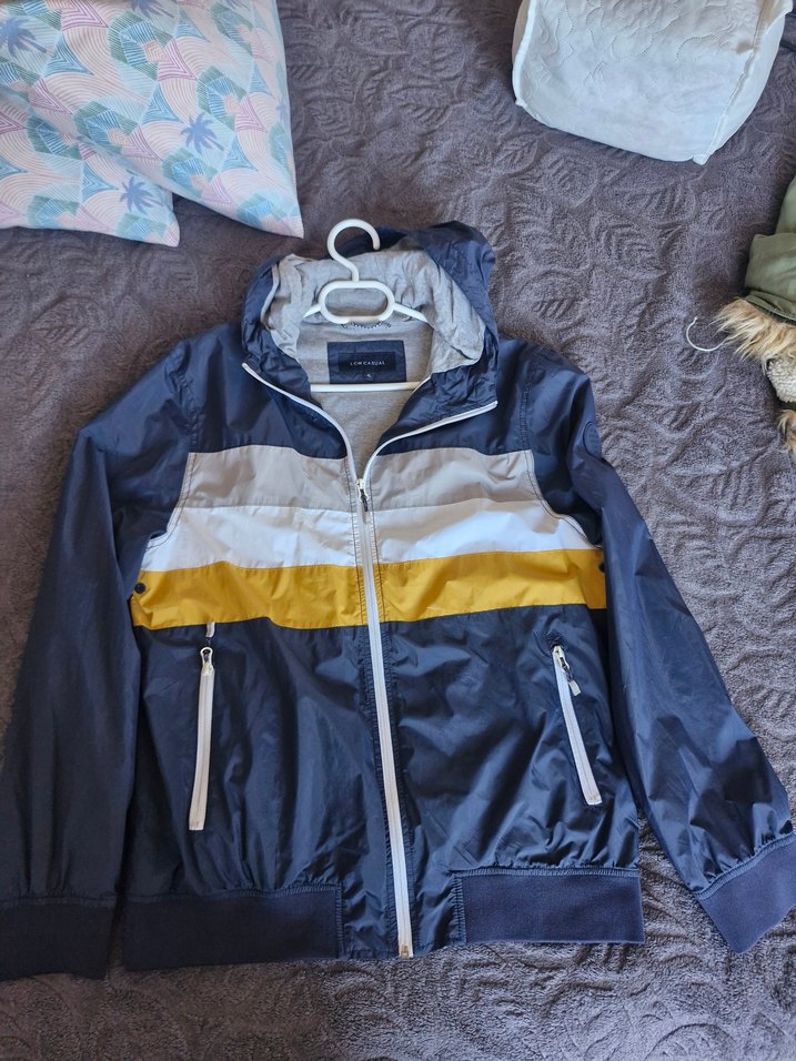 Yumuşak kumaştan, gri, beyaz ve sarı şeritli, fermuarlı ve uzun kollu, yakalı, fitted erkek ceket. Günlük kullanıma uygun.yagmurluk hic kullanılmadı esim kilo aldıgından dolayı olmuyor sayfamda baska ceketlerde var bakabilirsiniz