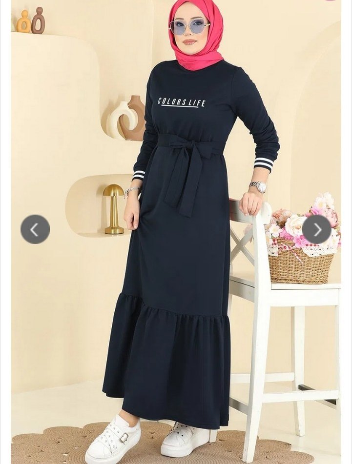 lacivert renkte, uzun kollu ve bisiklet yaka olan bu elbise, etek ucunda fırfır detayına sahiptir. Belden bağlamalı ve bol kesimdir. Üzerinde 'COLORSLIFE' baskısı vardır. Rahat sokak stiline uygundur.