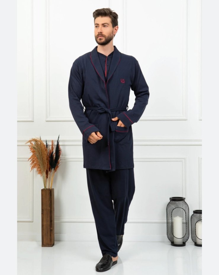 Lacivert renkte, uzun kollu erkek röpteşambır. Rahat kesimlidir.