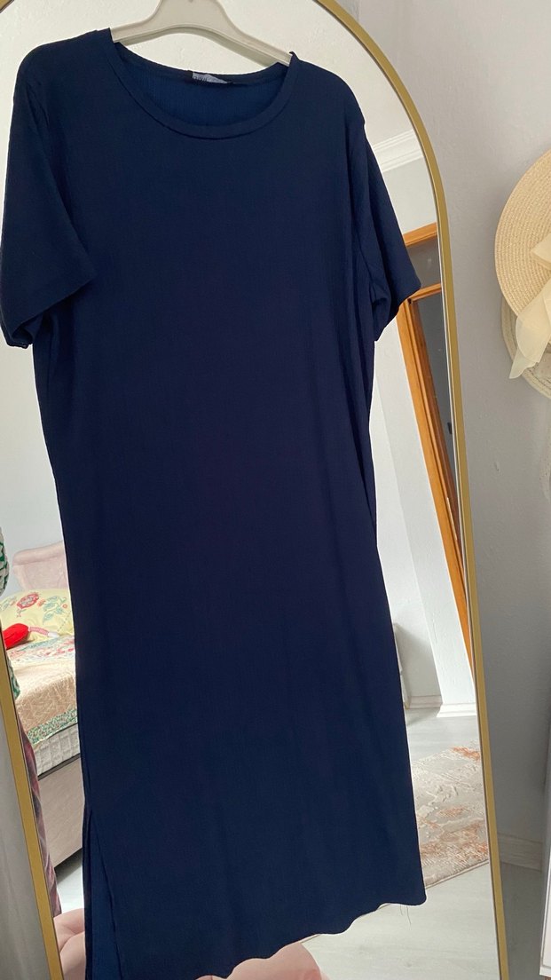 Lacivert uzun hamile elbisesi, kısa kollu ve yuvarlak yaka olup rahat bir salaş kesime sahiptir. Desensiz tasarımı ile günlük sokak stiline zahmetsiz şıklık katar.