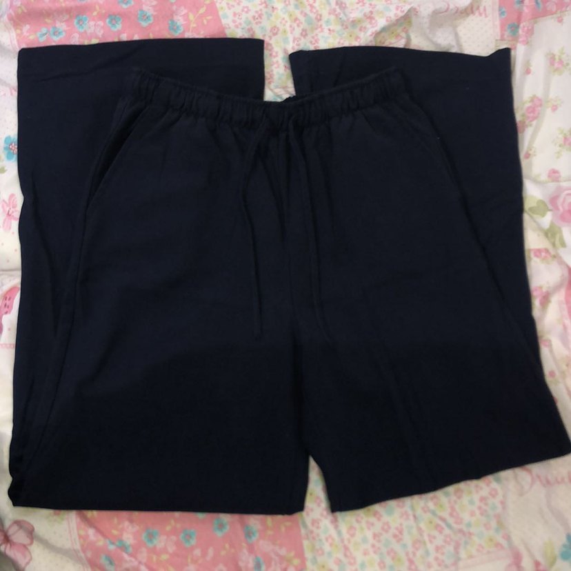 Lacivert, salaş kesim ve ipeksi dokulu kadın kumaş pantolon. Günlük kullanıma uygun, rahat ve minimalist tarzda.
