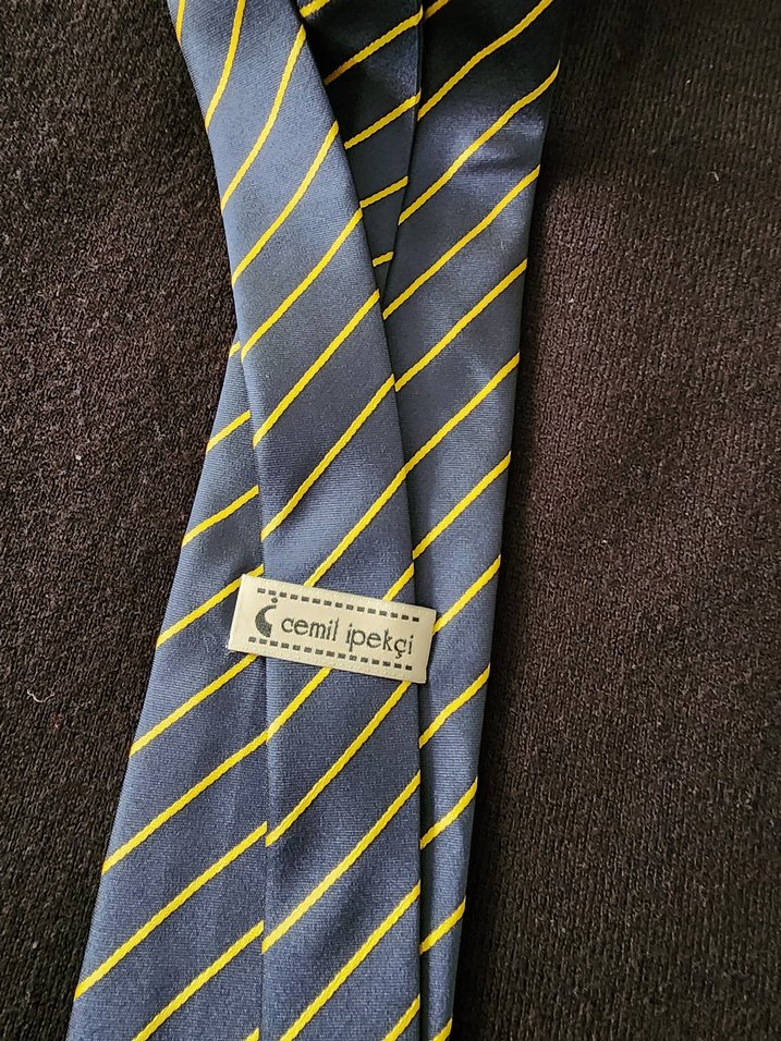 Lacivert zemin üzerine sarı çapraz çizgiler bulunan erkek kravatı, sade ve şık bir görünüm sunar. Üzerinde "cemil ipekçi" etiketi bulunur.