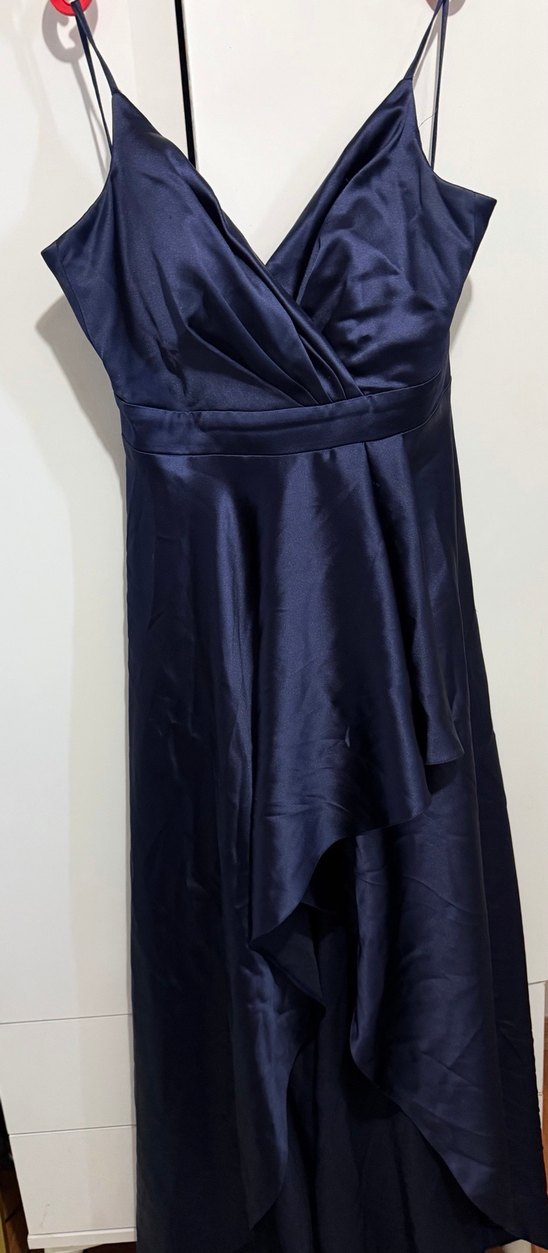 Lacivert, drapeli, uzun ve kolsuz abiye elbise. V yaka ve vücuda oturan kesimi ile şık bir görünüm sunar.