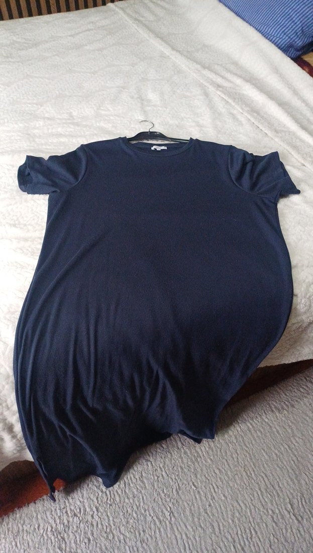 Lacivert renkli, saten görünümlü kumaştan, kısa kollu, yuvarlak yakalı, bol kesim hamile midi elbisedir. Dökümlü ve sade tasarıma sahiptir.