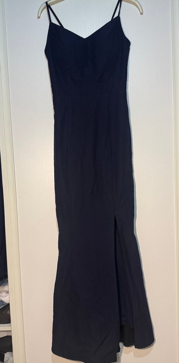 Saten kumaştan, yırtmaçlı ve kayık yaka detaylı, kolsuz uzun ve vücuda oturan lacivert elbise. Minimalist gotik tarzıyla romantik akşamlar için uygun. Dar bir kalıptır.