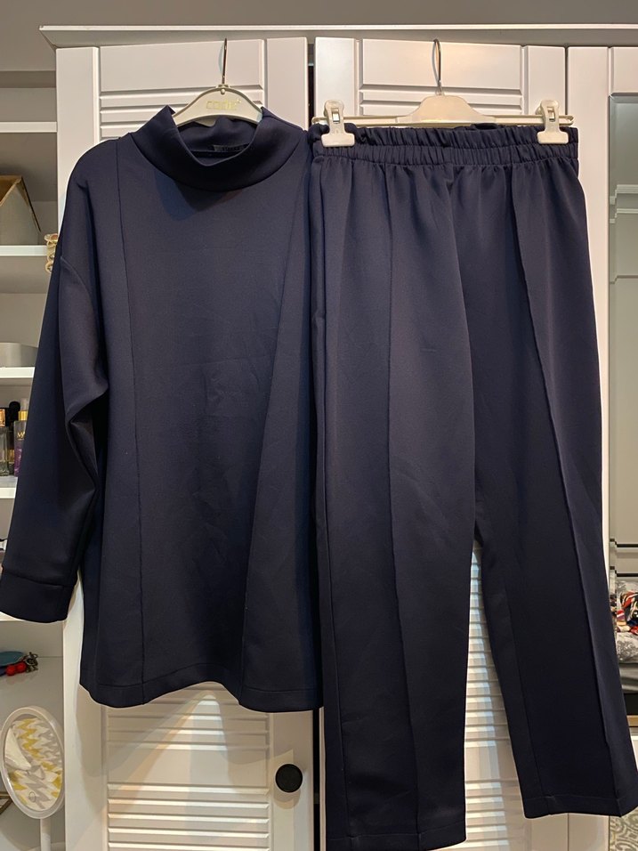 Kadınlar için lacivert eşofman takımı, yüksek yakalı ve uzun kolludur. Rahat kesim ve uzun boyda, yumuşak ve scuba kumaştan üretilmiştir. Günlük kullanıma uygundur. Ürün kullanıldı sweatin ön kısmında tüylenme vardır. Sweat boyu 75 cm’dir.