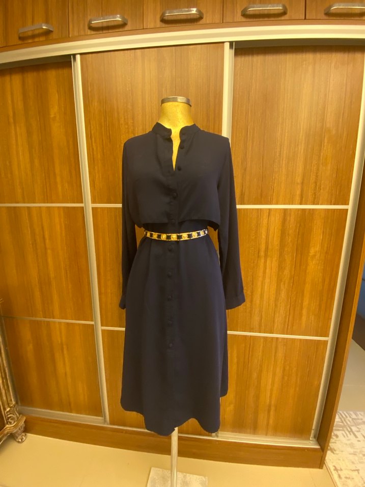 Lacivert , uzun kollu, yakalı ve kuşaklı bu elbise, ofis ve iş ortamına uygun, rahat kesimli ve ipeksi kumaştan üretilmiştir.