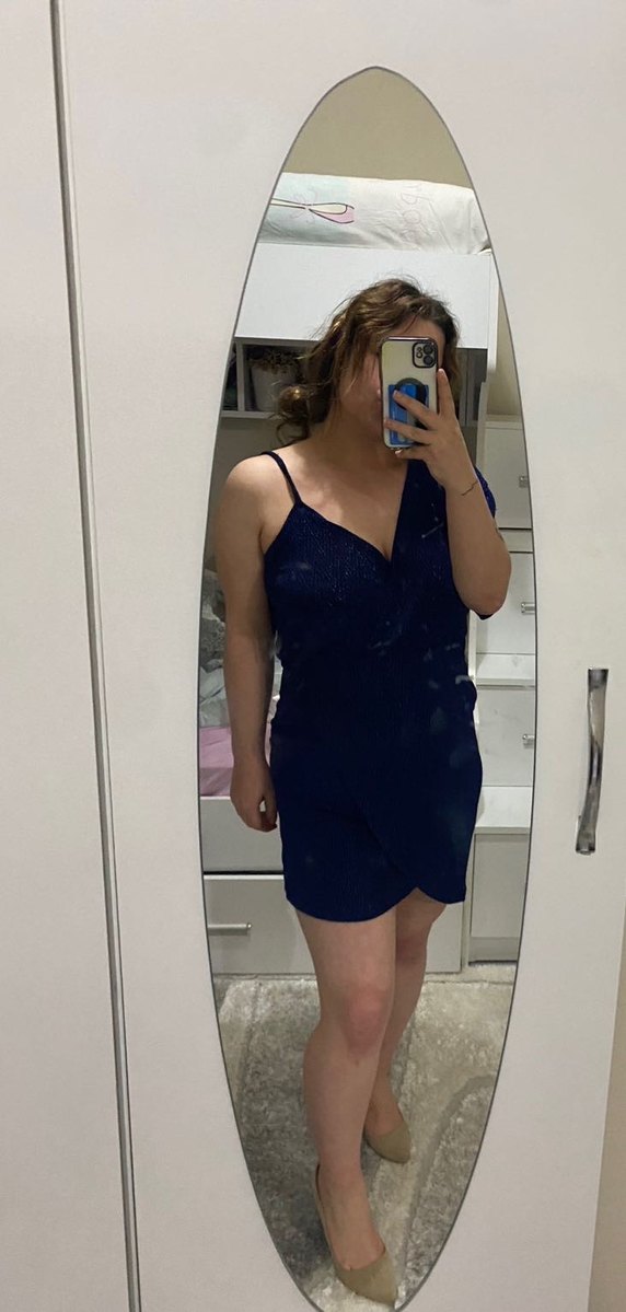 Lacivert vücuda oturan kısa elbise. 1-2 kez giyildi, hiçbir defosu yoktur. Boyum 1.58 64 kiloyum topuklu ile giydiğim görselini yükledim. Aşırı şık ve daha zayıf gösteriyor.