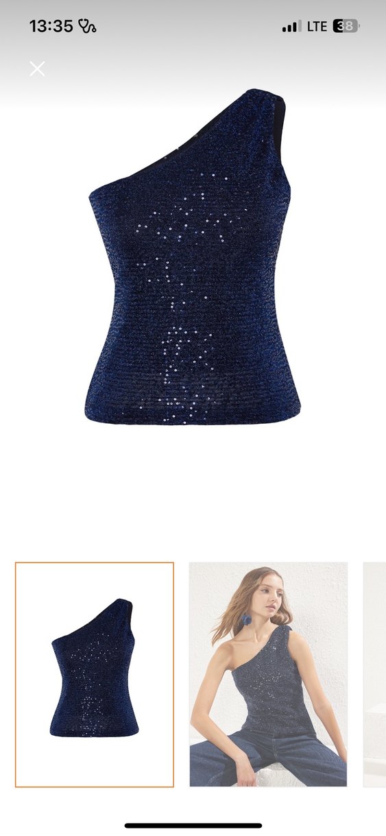 1 defa giyildi.Hiç bir defosu yok. Koyu mavi, simli, tek omuzlu ve kolsuz kadın bluz. Sentetik kumaş, dar kesim ve midi boy, parti için uygun modern tarzda.