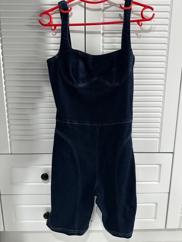 Lacivert Sırt Dekolteli Kısa Denim Tulum