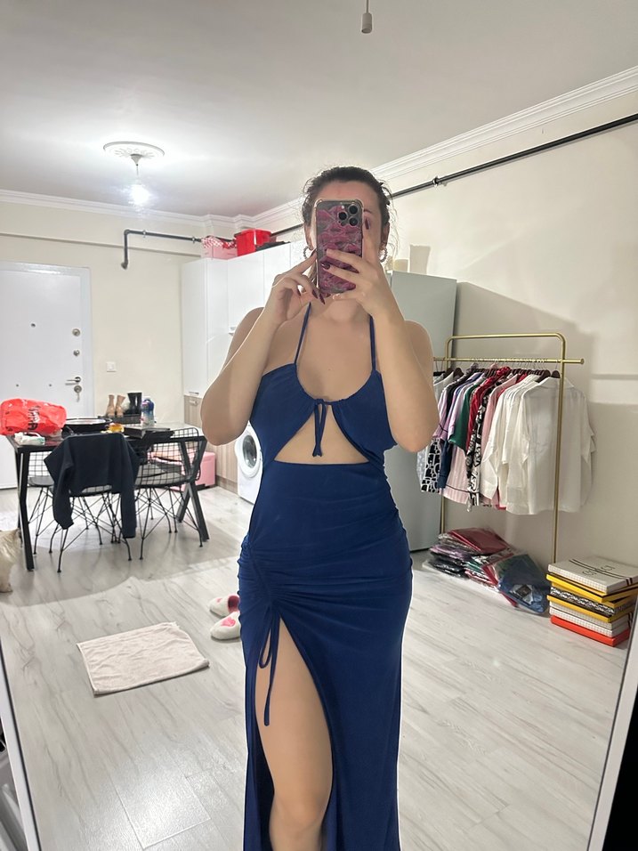 Lacivert denim kumaştan, straplez yakalı ve ince askılı, bacak yırtmaçlı midi boy dar kesim elbisedir. Romantik akşamlar için cesur ve göz alıcıdır.