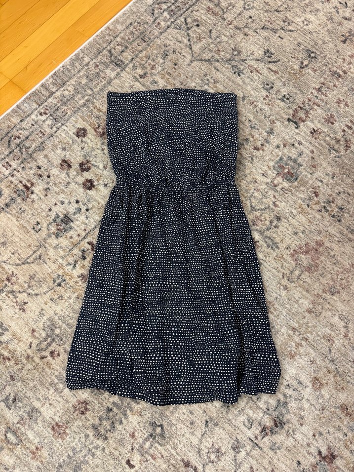 Straplez benekli elbise. Belindeki lastik 29cm. Elbise boyu 74 cm. İç kısmında lastik kaymaması için. Hiçbir sıkıntısı yok yeterince giydiğim için satıyorum