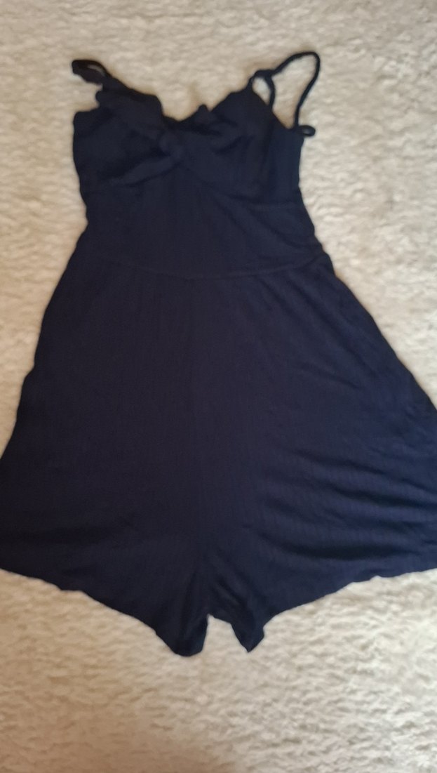 Lacivert, kolsuz, straplez yaka ve drapeli detaylı, vücuda oturan kadın tulumu. Yumuşak ve rahat kumaştan midi boyda, gotik tarzda, romantik akşamlar için uygun.