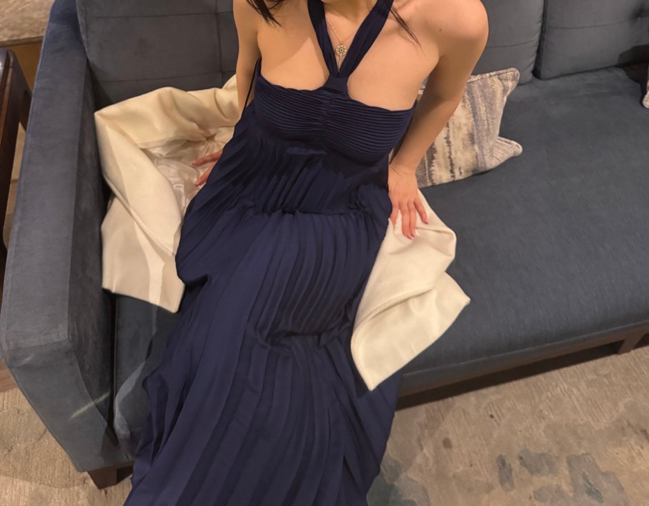 Lacivert renkte, straplez ve askılı detaylı, pilili uzun elbise. Yumuşak sentetik kumaştan, bohem ve klasik Paris tarzında, düğün için uygun.