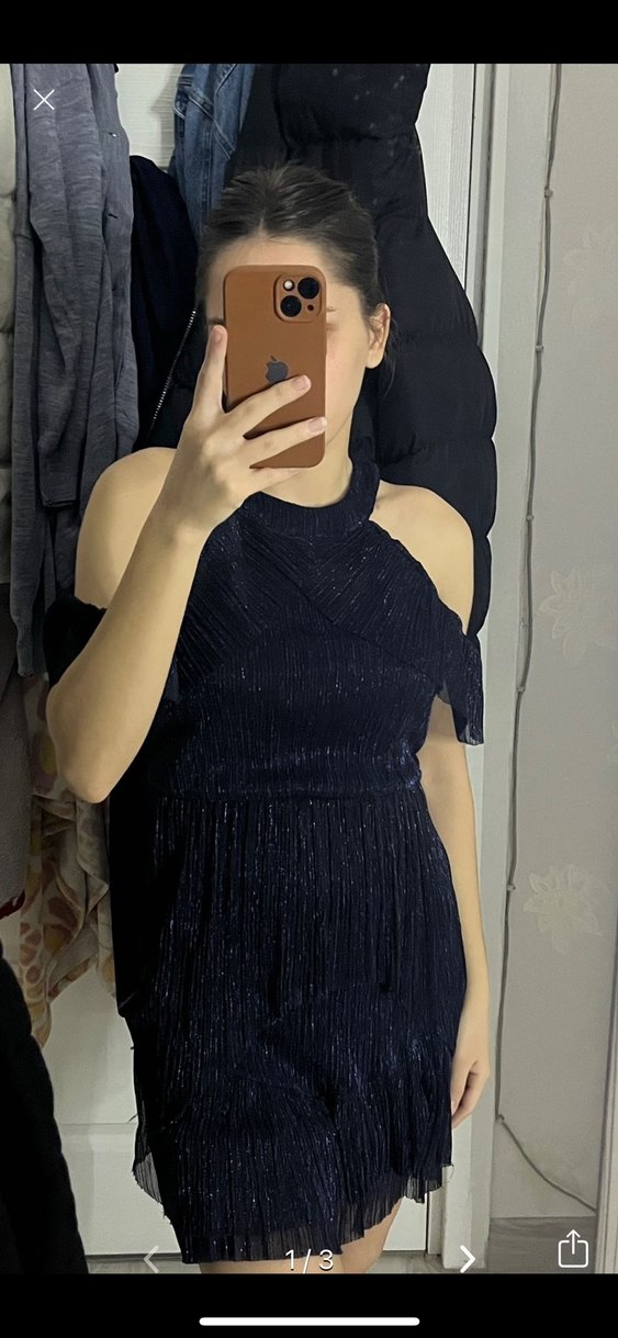Lacivert, straplez yaka ve püsküllü detaylı, vücuda oturan midi uzunlukta abiye elbise. Kolsuz ve cesur parti stiline uygun.