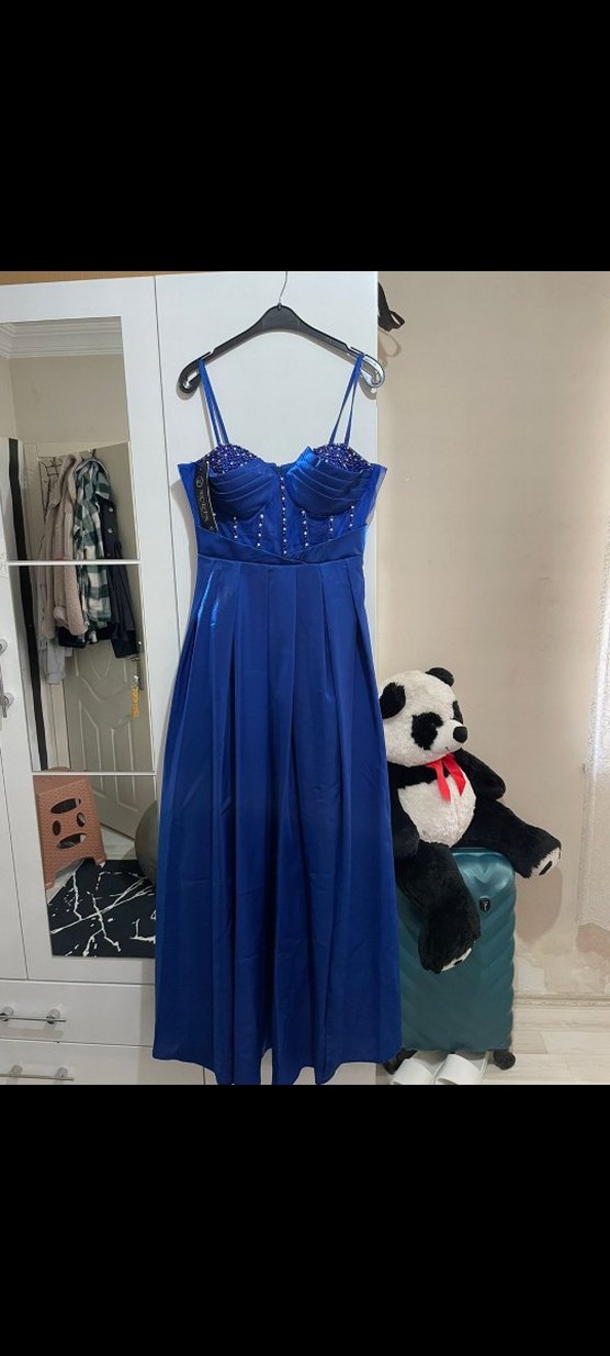 Lacivert uzun abiye elbise, straplez ve ince askılı, pileli detaylarla şık bir görünüm sunar. Parlak kumaşıyla düğünler için gundur. ✨