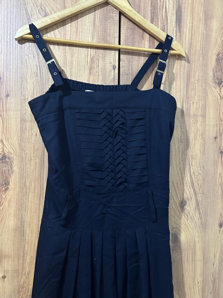 Lacivert renkli, askılı ve pliseli detaylara sahip uzun elbise. Sentetik kumaştan yapılmış, gothic tarzda ve regular fit kesimlidir. Günlük kullanıma uygundur. ✨