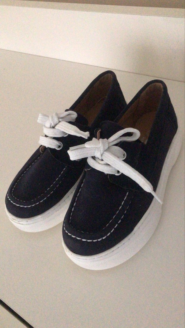 Lacivert süet malzemeden yapılmış, beyaz bağcıklı ve düz beyaz tabanlı kadın günlük ayakkabısıdır.