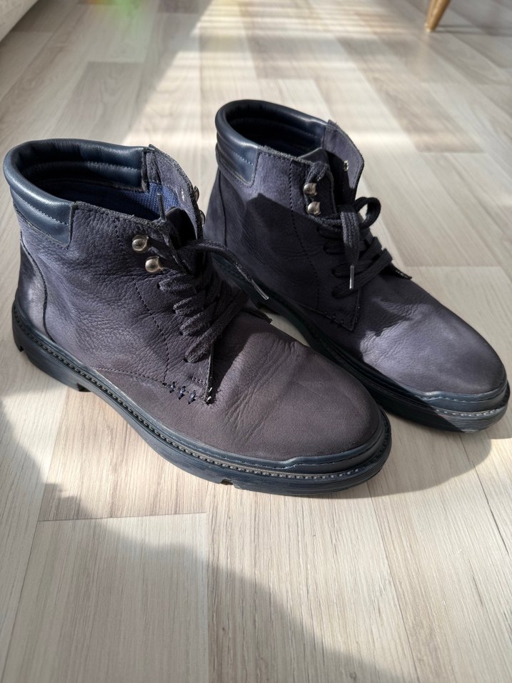 Lacivert süet malzemeden yapılmış, bağcıklı erkek botlarıdır. Sokak stili ve günlük kullanım için uygundur, rahat bir görünüm sunar. YALNIZCA BİR KEZ KULLANILDI.