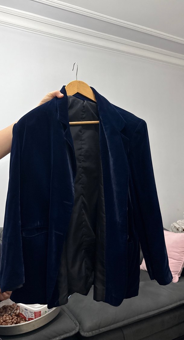 Lacivert süet kumaştan yapılmış, düğmeli, normal uzunlukta, regular fit kadın blazer ceket. Ofis kullanımı için uygundur.