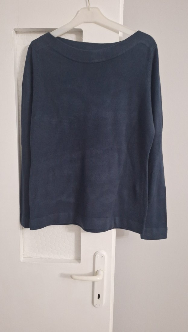60 cm Lacivert süet kumaştan, salaş kesim ve uzun kollu kadın triko. Minimalist ve rahat stil için ideal, normal midi boyda.